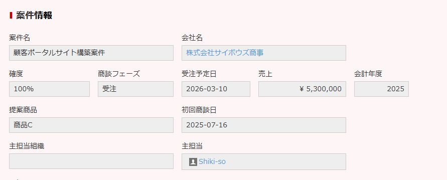 会計年度の数値(例: 2025)を保存すれば、受注予定日に基づく絶対値なので時間が経っても値が陳腐化しません。「今期の案件」を見たいときは一覧画面のフィルタで年度を指定するだけです。